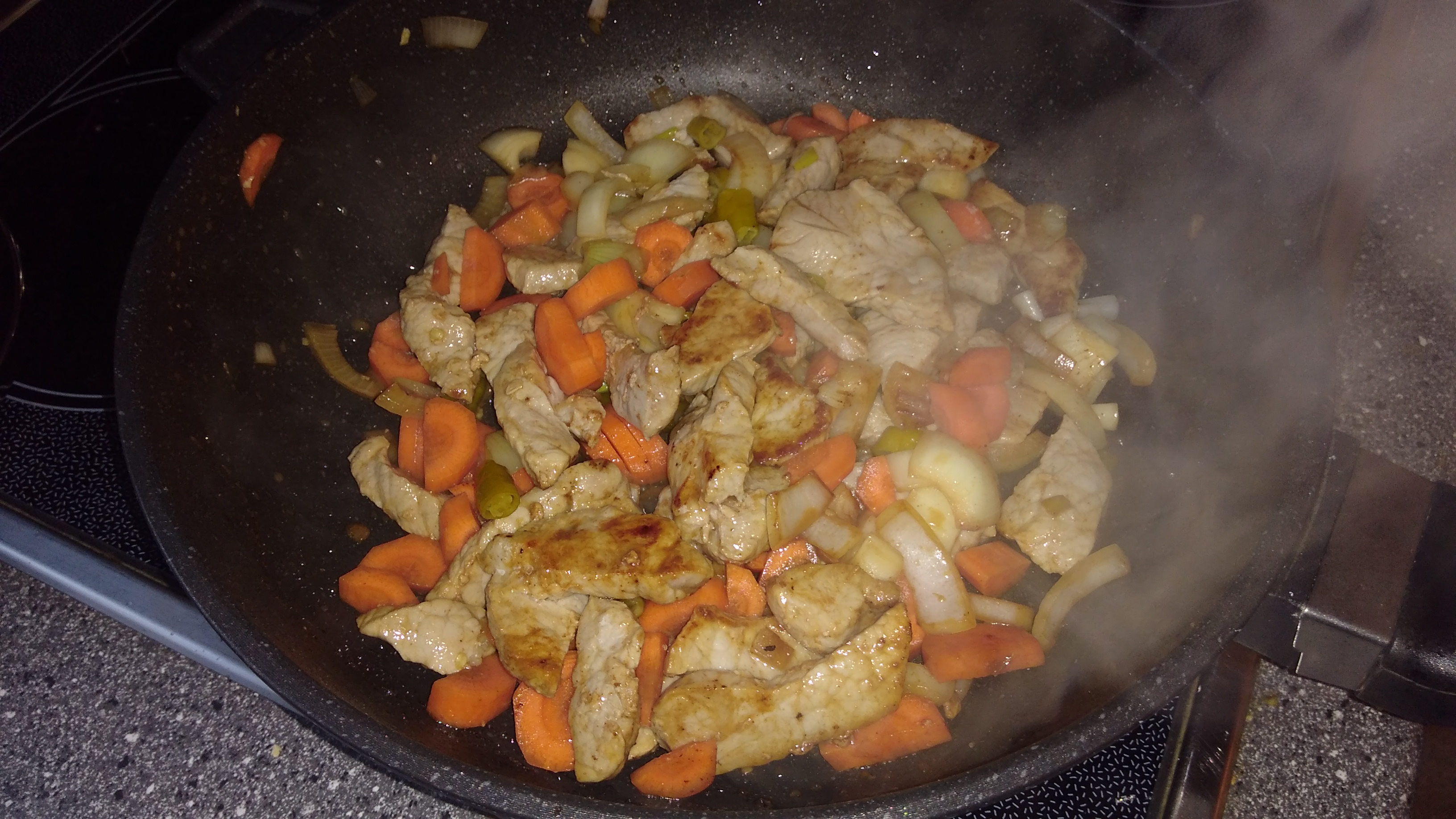 Fleisch, Zwiebel und Karotten klein schneiden und mit etwas Öl Scharf Anbraten.