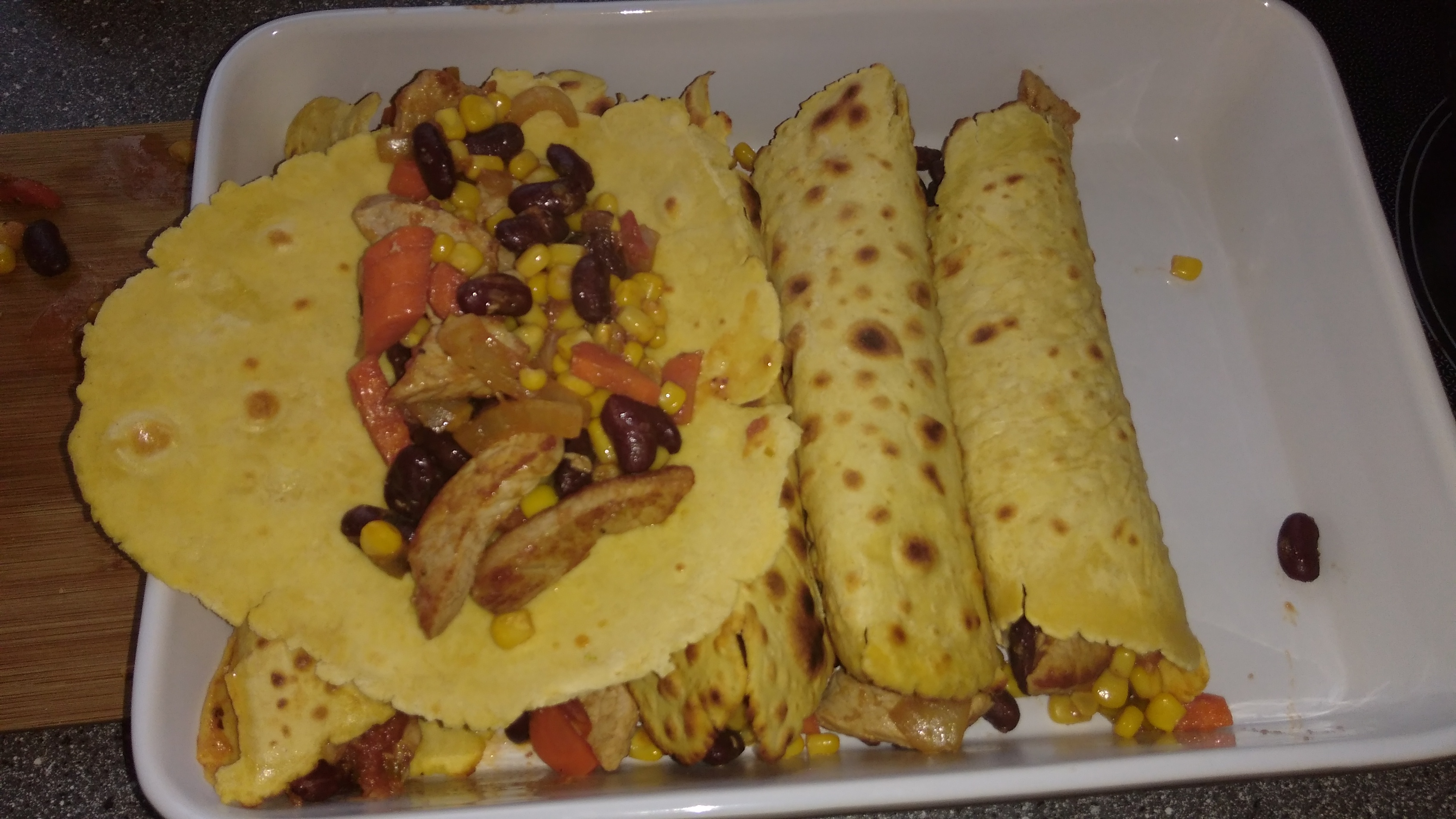 In die Mitte der Tortillas die Füllung und ca. 2 Löffel Sauce geben.
