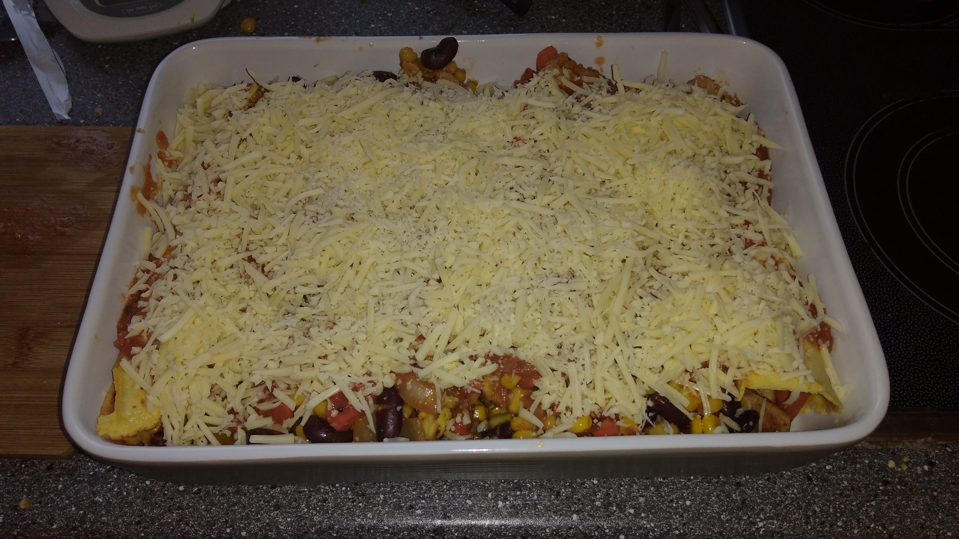 Die restliche Füllung und Sauce in der Form verteilen und mit Käse bestreuen.