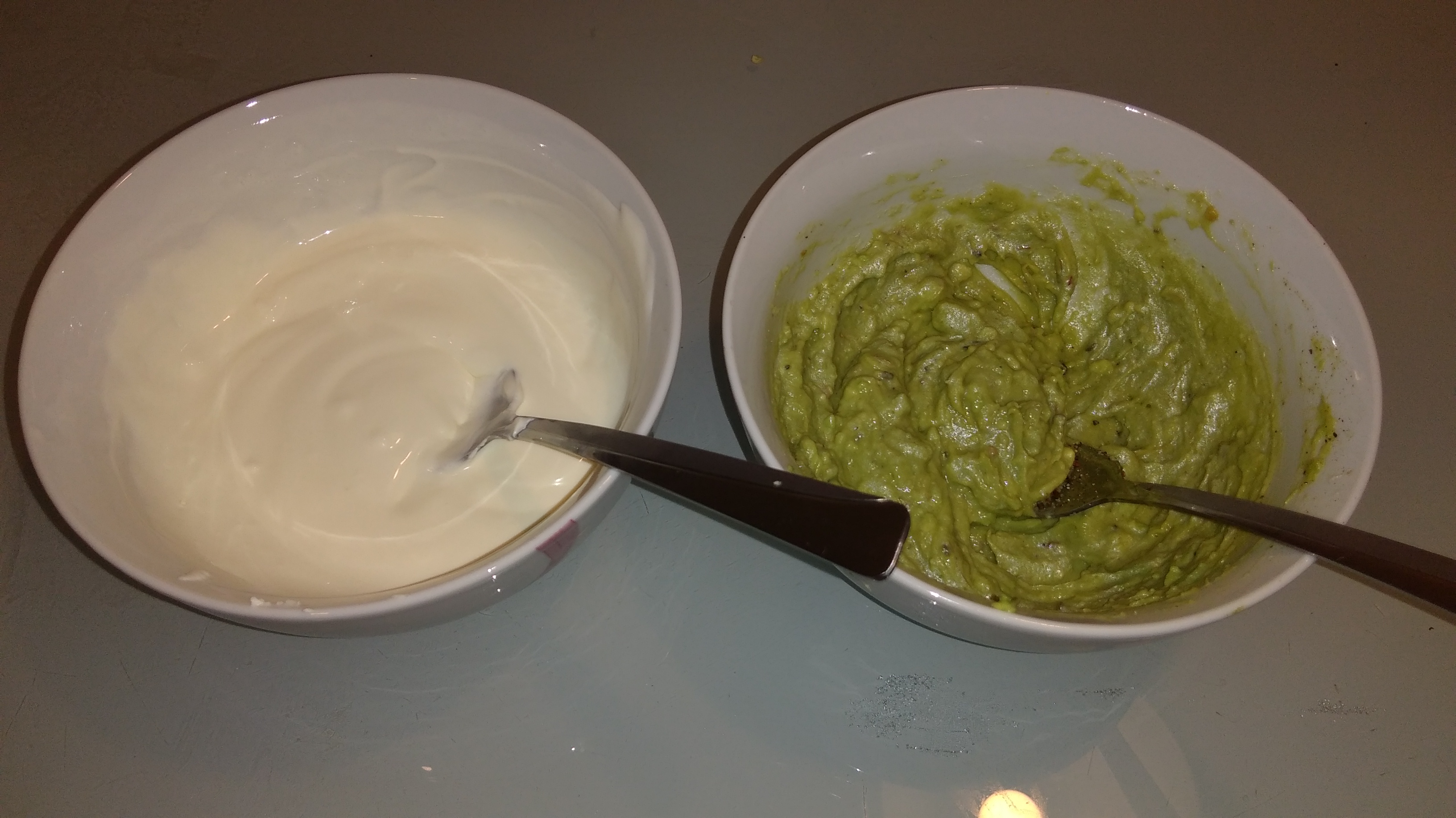 Avocado mit einer Gabel zerdrücken und mit Limettensaft, Pfeffer, Chili und Salz würzen.
