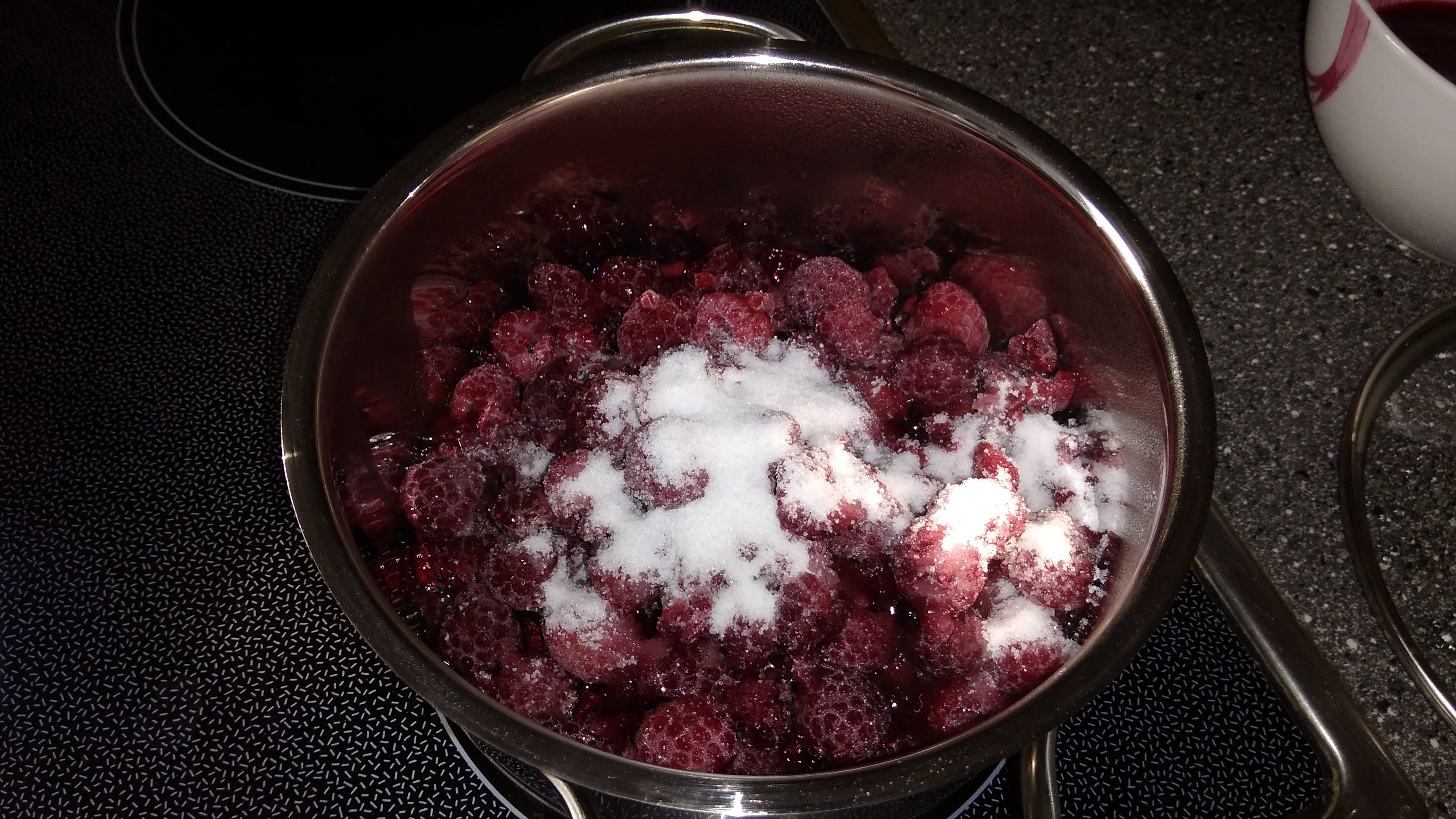 Himbeeren und Zucker in einem Topf verrühren und erhitzen
