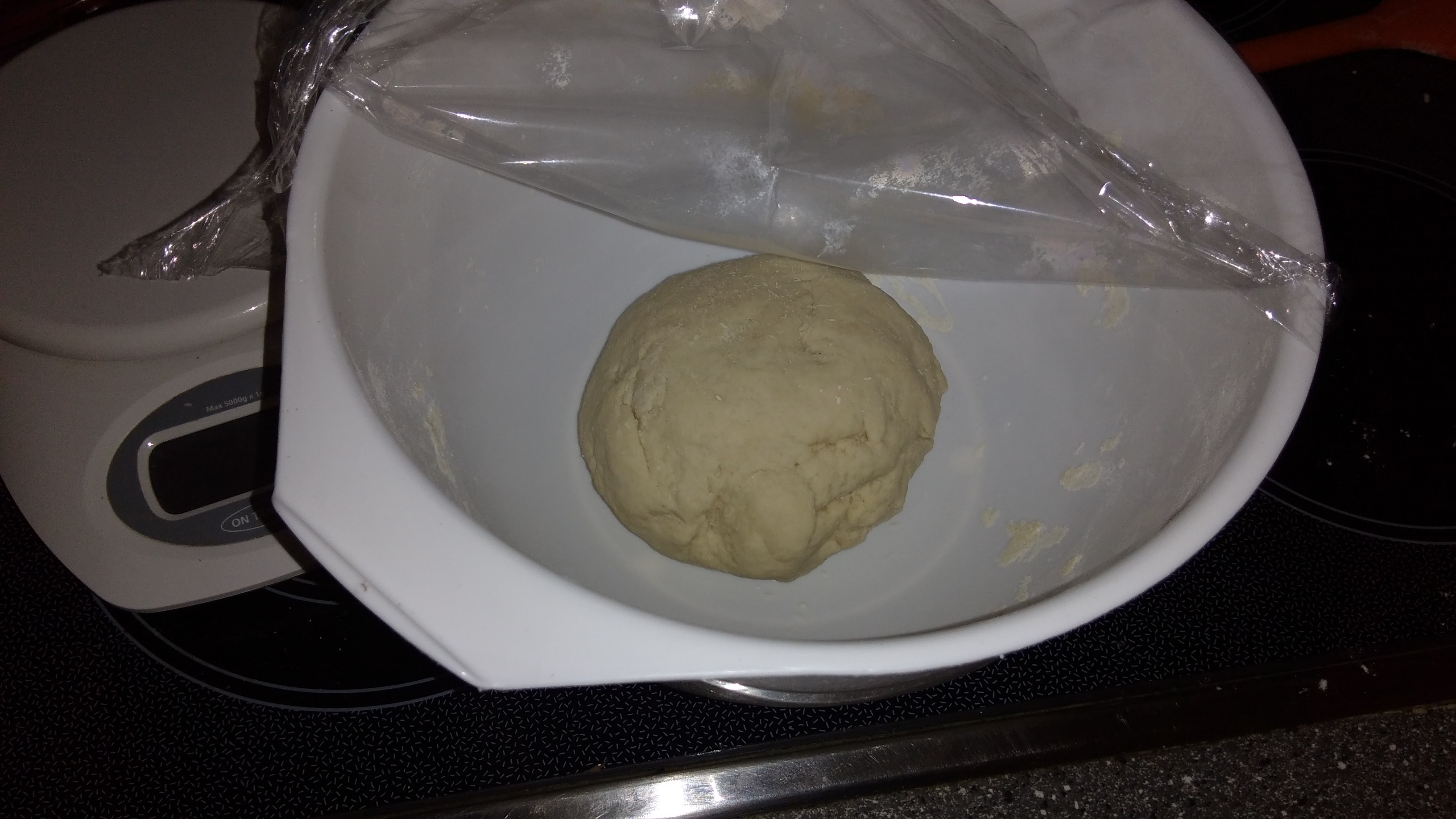 - Mehl und kochendes Wasser zu einem Teig verkneten und eine Stunde in Folie rasten lassen.