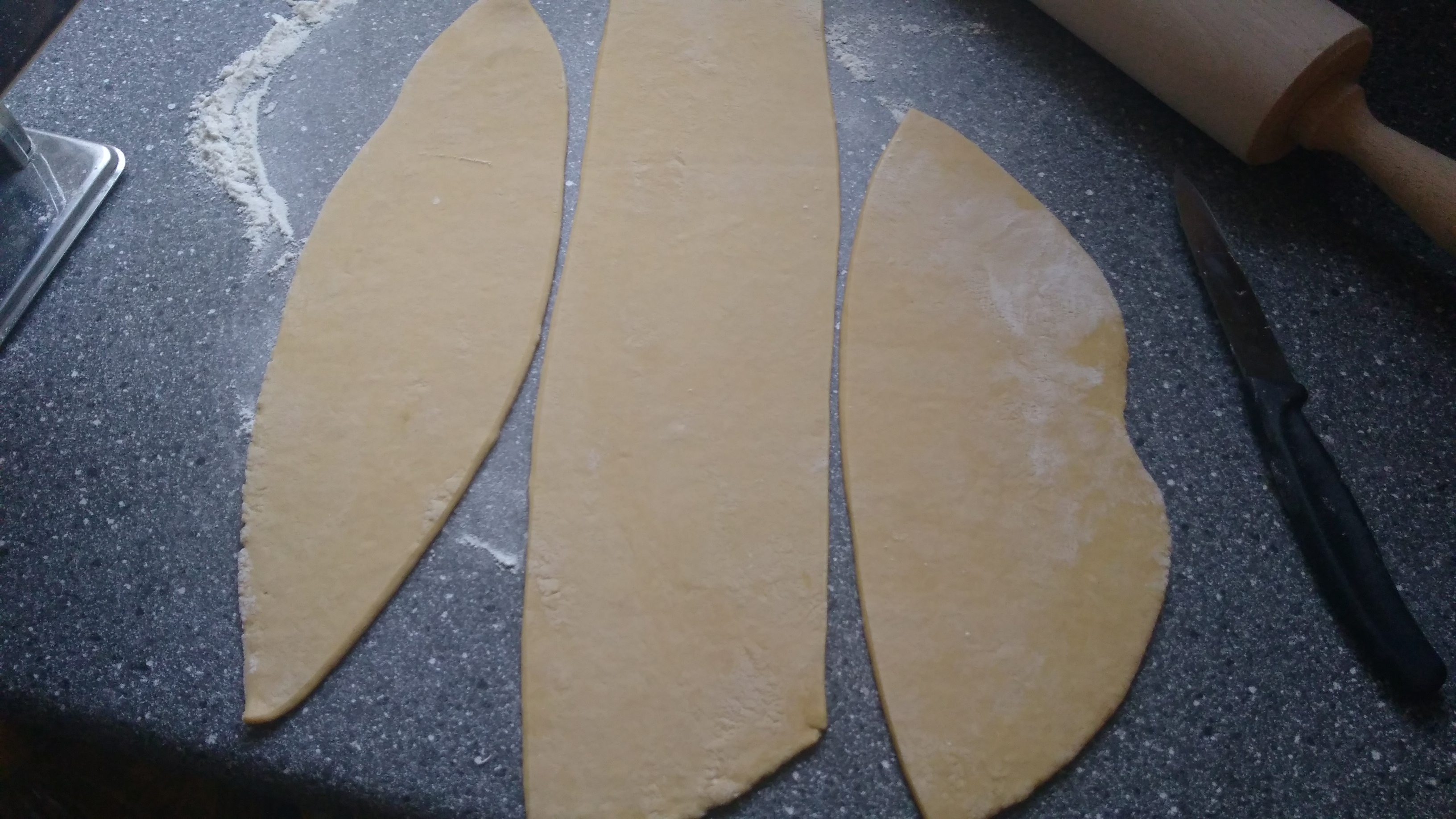 - Den Teig auf einer bemehlten Fläche ausrollen und in Streifen Schneiden.