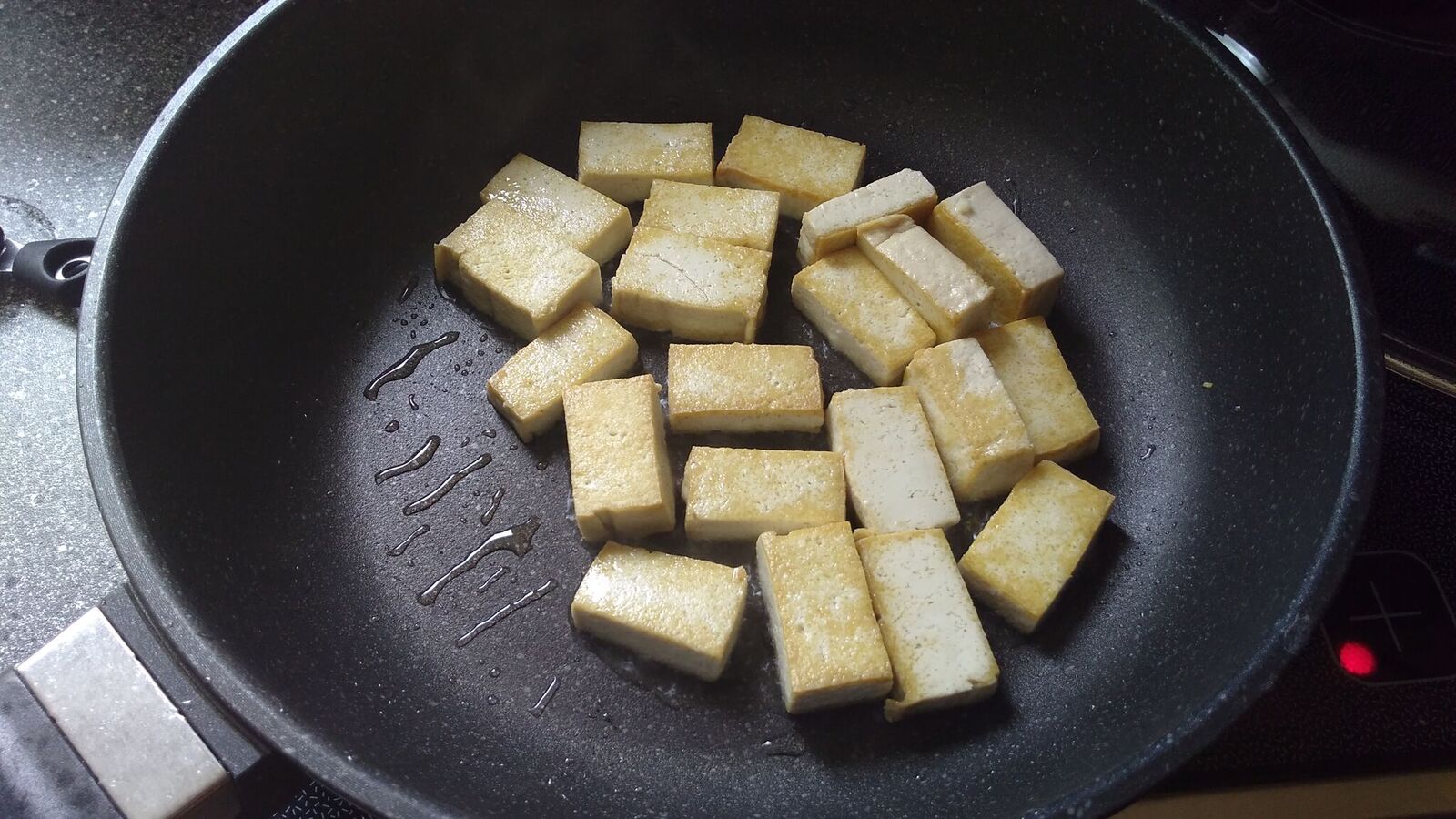 - Nach 5 Minuten kochen den Tofu hinzugeben und die Temperatur reduzieren.