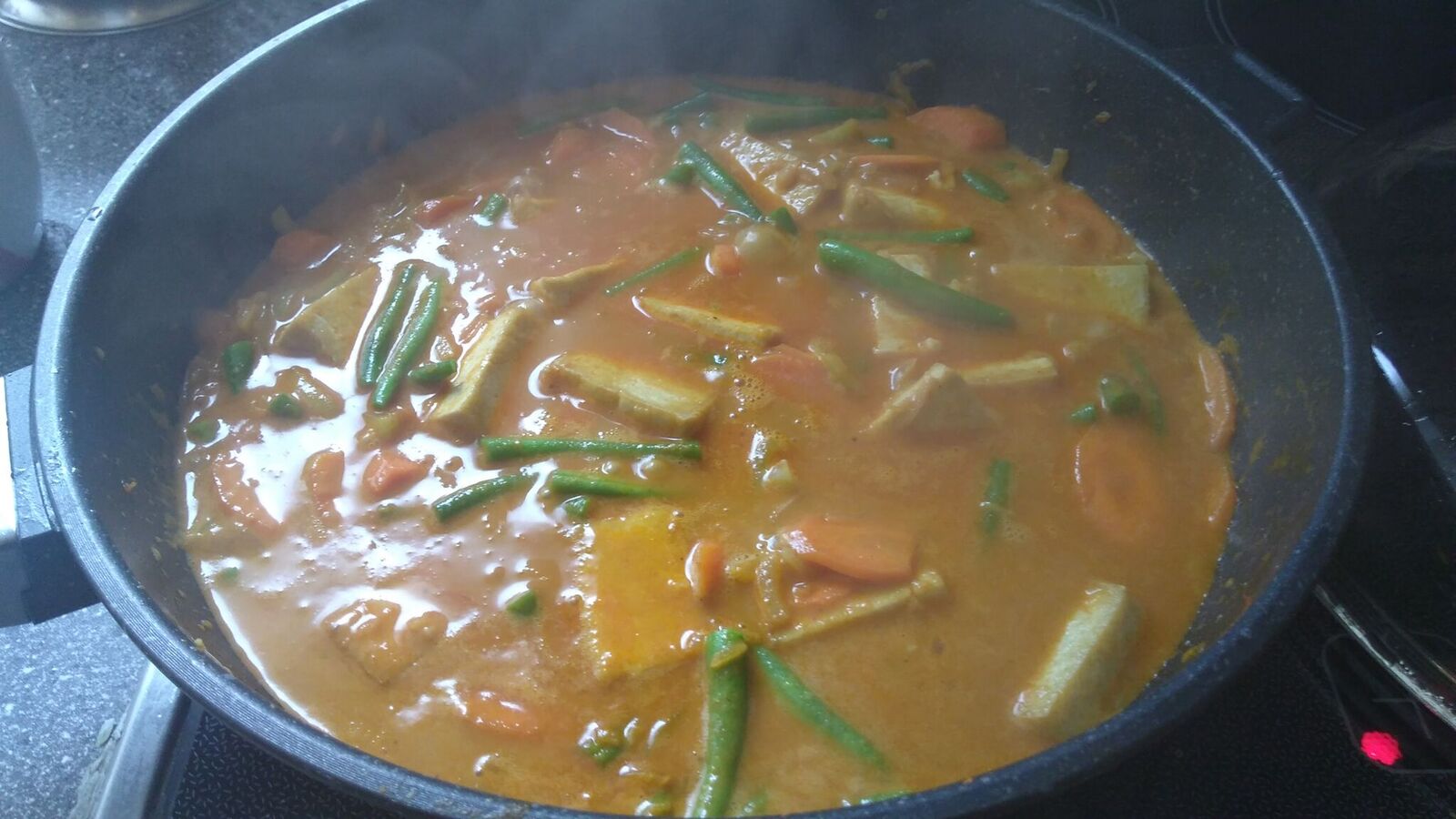 - Mit der Kokosmilch ablöschen und das Gemüse hinzugeben.